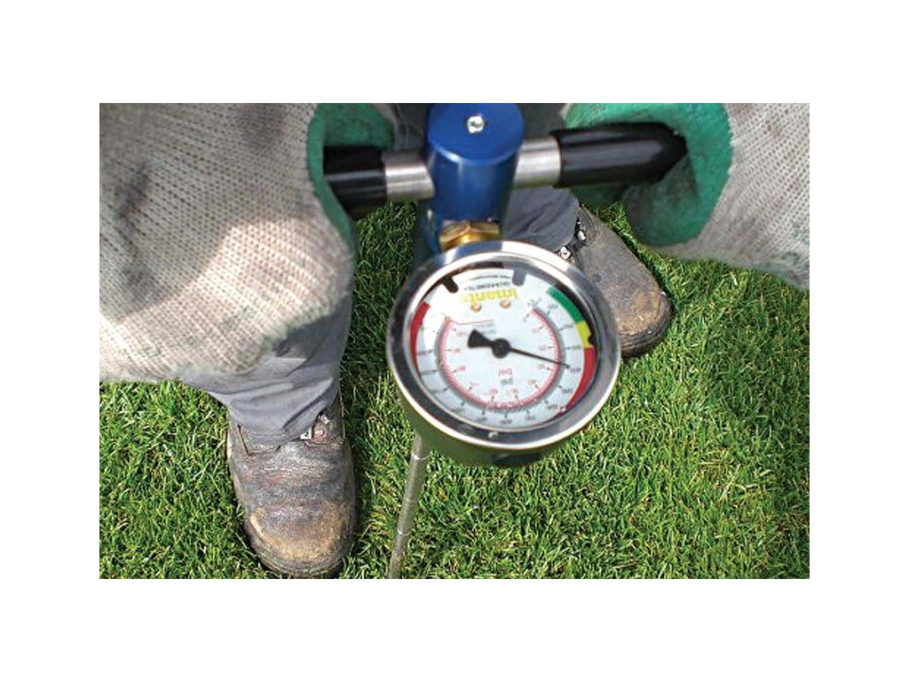 Ručný penetrometer pre ľahký monitoring zhutnenia pôdy. Prístroj meria odpor pôdy pri prenikaní hrotu do hĺbky až približne 52,5 cm a zobrazuje okamžité hodnoty tlaku na prehľadnom manometri (0–60 bar / psi). Vďaka značkám na tyči je možné sledovať zhutnenie v rôznych hĺbkach a presne identifikovať problémové vrstvy.